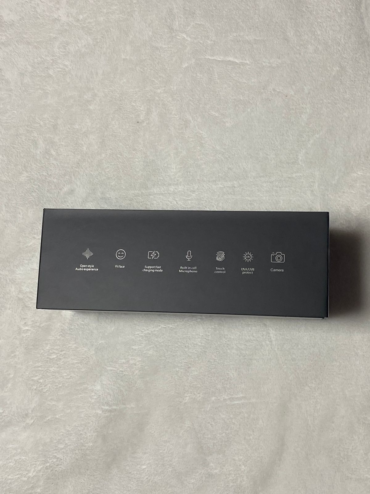 El empaque destaca las principales características del modelo: experiencia de audio abierto, ajuste cómodo, carga rápida, micrófono integrado para llamadas, control táctil, protección UV y cámara incorporada. Tecnología y estilo en un solo dispositivo.
